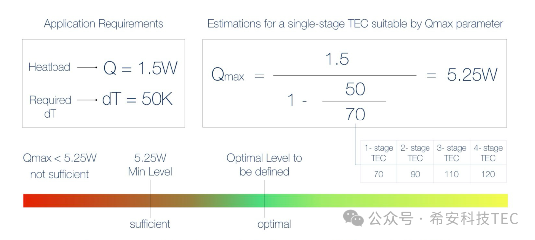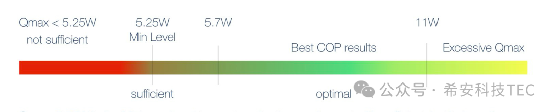 Kernekravene til TEC-valg: belastning Qc, driftstemperatur Tc, varmende temperatur Th, Dt=Th-Tc. For eksempel: Qc=1,5W, Dt=50K, Qmax=1,5(1-50/70)=5,25W. Er denne Qmax 5.25W den optimale løsning? Nej, 5,25 er den mindste Qmax i denne applikation. Qmax er ikke nødvendigvis jo større jo bedre. Hvis det er større, vil antallet af PN-par være større, og selve energiforbruget vil være mere. Hvordan man beregner denne optimale Qmax er ret kompliceret og kræver meget professionelle termiske designingeniører.