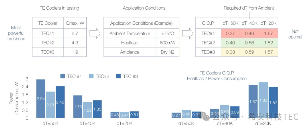 Som vist i den følgende figur har vi valgt tre grupper af TEC, forskellige Qmax, men det samme applikationsmiljø. COP for TEC# 1 er den laveste, mens dens Qmax er den største.