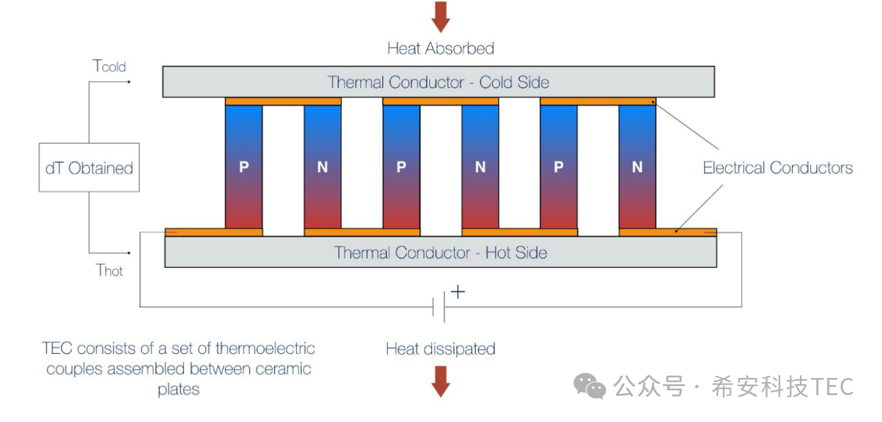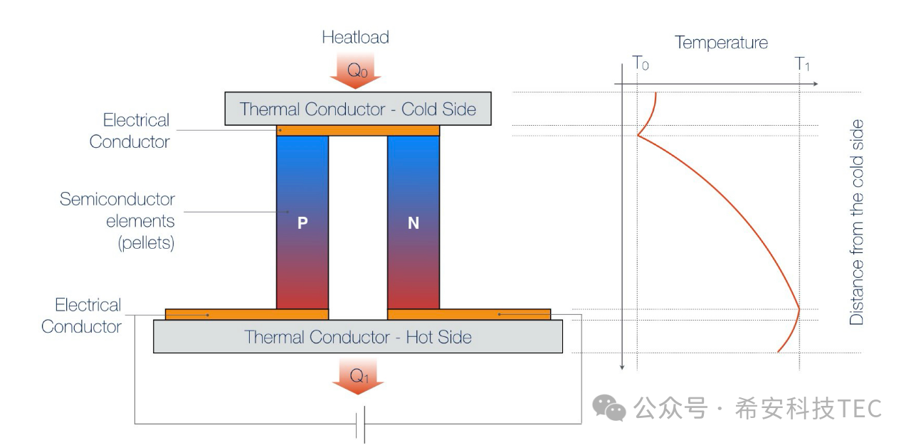 PN-forbindelsen, gennem det ledende lag, danner et termoelement og er den kernestrukturelle komponent i TEC. Et enkelt par termoelementer kan også opnå funktionerne køling eller opvarmning efter at være blevet tændt.