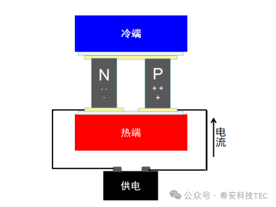 Princippet om halvlederkøling (Peltier-effekt) : når strømmen passerer gennem kontaktfladen mellem p-type og n-type halvledermaterialer, migrerer bærerne og absorberer varme for at opnå afkøling (den kolde ende), mens varme frigives på den anden side (den varme ende)